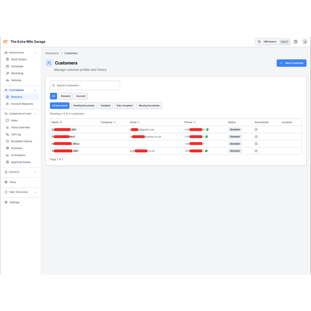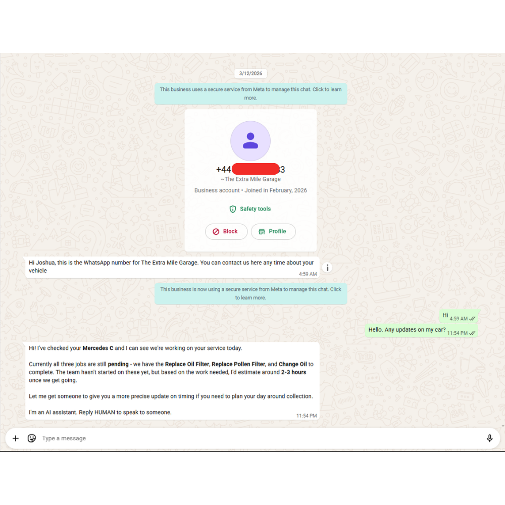 A real phone number for your garage, answered by AI that knows what’s happening in your workshop right now. It handles status enquiries, books appointments, and only rings you when it genuinely needs to. Works with UK phone numbers your customers already know.