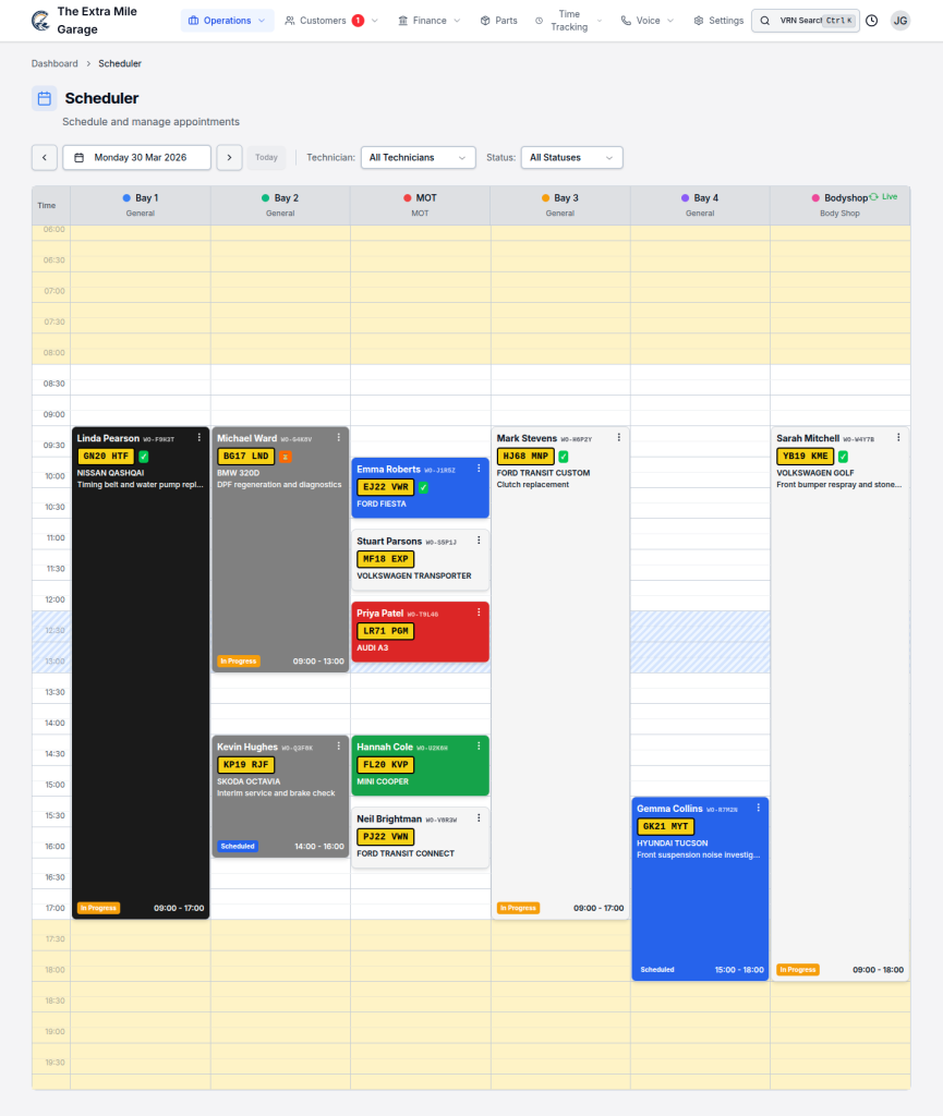 Multi-day job scheduling that mirrors how real repairs work. See every bay, every job, every technician – at a glance. No more sticky notes, no more whiteboards.