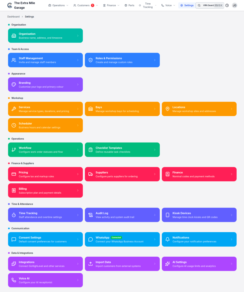 MOT history lookups, automatic VAT calculations, and UK-compliant invoicing. No plugins, no workarounds – it’s built for British garages from the ground up.